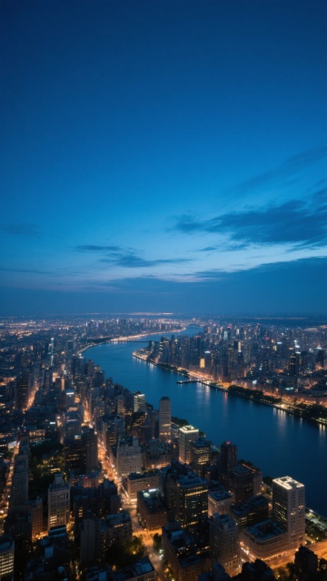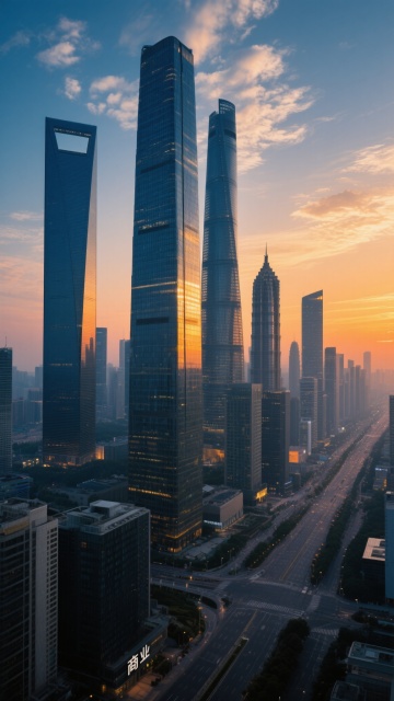 一张极具商业氛围的城市天际线海报,采用超写实风格的摄影手法,以黄昏时分的现代都市全景为主体。画面中,高耸入云的玻璃幕墙摩天大楼群占据核心位置,其中几栋标志性超高层建筑尤为突出,展现出城市的繁华与力量感。整体色调以深蓝、靛蓝与橙色、金色的晚霞渐变为主,色彩和谐且富有层次感,天空中飘着形态优美的云彩,光影运用细腻,建筑物玻璃表面反射着落日余晖与城市初上的华灯,呈现出温暖而辉煌的高光效果与深邃的阴影细节,营造出既宁静又充满活力的氛围。构图采用经典的三分法,地平线平稳,建筑群从左至右疏密有致地延伸,具有强烈的视觉引导线和深远的空间感。设计上注重视觉层级,以震撼的城市景观作为核心视觉焦点,突出“商业”主题所蕴含的繁荣、现代与机遇感,信息传达高效,能迅速抓住目标受众(潜在投资者、商业人士、城市居民)的注意力,符合商业宣传所追求的高端、大气、积极向上的设计感。画面清晰展现了城市的道路网络、建筑群的材质质感与形态结构,以及它们之间的空间位置关系,整体呈现出高清晰度、高细节的专业摄影品质。