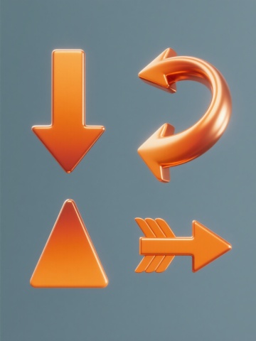 一组6个同系列3D立体风格上升箭头设计素材集合,每个箭头保持流畅曲线造型与光滑渐变金属质感,均采用纯色背景突出主体,箭头整体呈向上攀升的动态姿态,光影过渡自然柔和,具有现代简约的设计感。6个箭头分别拥有不同的配色方案(如蓝色渐变、绿色渐变、紫色渐变、红色渐变、黄色渐变、青色渐变等),并在箭头的弯曲弧度、尖端角度、整体比例等造型细节上略有变化,同时从不同视角展现(如轻微左倾、轻微右倾、更陡的上升角度、稍缓的上升角度等),所有箭头元素规整排布,形成既统一又富有变化的系列设计。