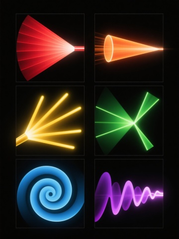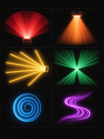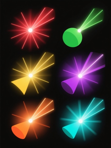 纯色背景上,六个造型完全不同的激光元素系列素材集合规整排布,每个激光元素均保持原图的数字艺术风格,具有明亮的核心光点、渐变的光束和柔和的光晕效果。第一个是红色斜向激光束,光点圆形;第二个是蓝色垂直向上的激光射线,光点星形;第三个是绿色弯曲的激光弧线,光点方形;第四个是黄色螺旋状激光轨迹,光点三角形;第五个是紫色分叉激光束,光点多边形;第六个是橙色环形激光波纹,光点十字形。所有激光元素色彩鲜明,光影过渡自然,整体布局整齐有序,视觉效果统一且富有变化。