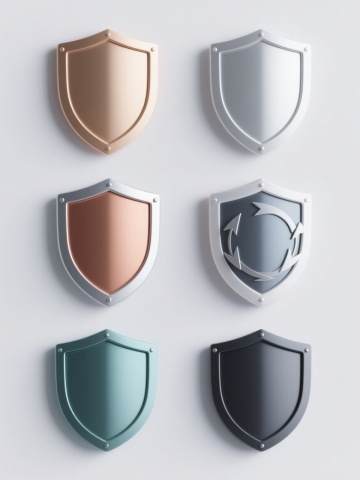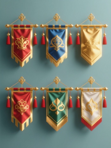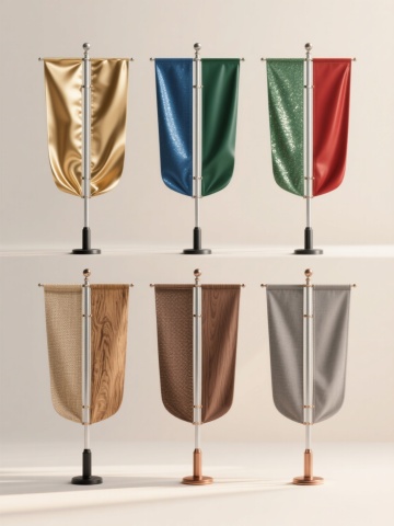 3D渲染风格,6个不同配色、不同样式、不同材质的道旗造型,浅灰色简约背景,上下两行各3个道旗整齐对齐排列,道旗采用金属银色支架与黑色圆形底座,每个道旗旗面呈现真实布料褶皱质感,光影效果为柔和顶部光源,轻微阴影增强立体感,整体构图简洁大气,突出道旗设计细节与材质对比,无任何文字、LOGO及装饰元素。
