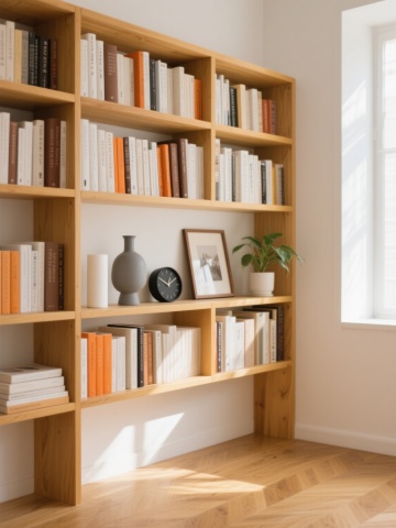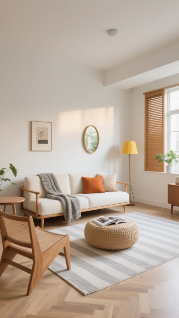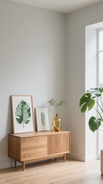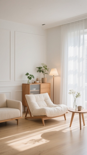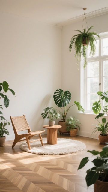北欧风格室内客厅场景,自然光透过白色窗框洒入,温暖柔和的灯光从黑色金属支架落地灯散发,照亮整个空间。深棕色实木书柜靠墙而立,玻璃门内整齐排列书籍,顶部摆放多盆大型绿植。浅米色布艺懒人沙发上,一只灰白相间的猫咪端正坐卧,眼神警觉。地面铺设人字形拼接的浅色木地板,中央铺有几何图案的灰白色地毯,地毯上放置一张小型实木茶几,茶几上摆放着一块紫色水晶摆件。右侧胡桃木色矮柜上,陈列着复古相机、三根点燃的蜡烛和几本书籍,周围散落着多盆不同种类的绿色植物,包括龟背竹和蕨类,营造出自然清新、舒适温馨的居家氛围。