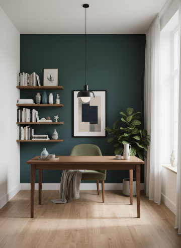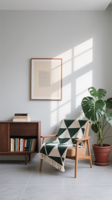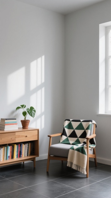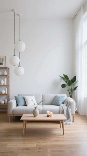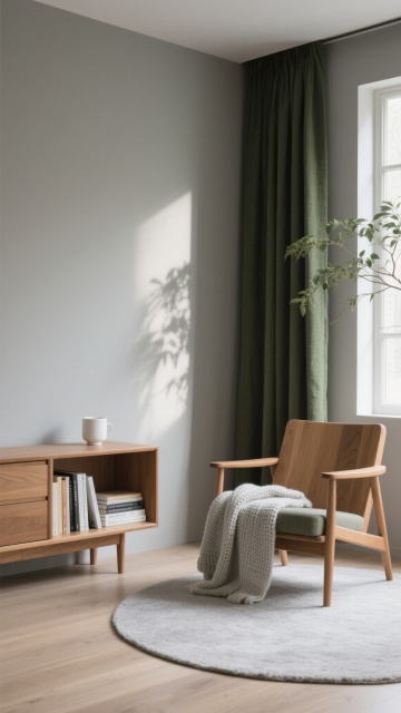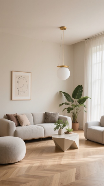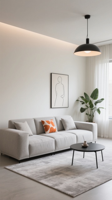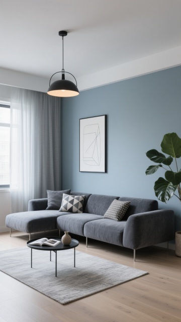 现代简约风格的客厅室内设计,主体为一个线条流畅、造型独特的模块化布艺沙发,沙发采用深灰色高级绒布面料,搭配几个不同大小和纹理的几何图案靠垫,沙发下方是纤细的金属支撑腿。客厅整体色调以冷静的灰蓝色为主,墙面为浅灰色哑光质感,地面铺设浅色宽木地板。左侧有一扇大窗户,悬挂着半透明的浅灰色垂坠感窗帘,阳光透过窗户柔和地洒入室内。沙发前铺着一块浅灰色带有细腻纹理的长方形地毯,地毯上放置一个圆形黑色金属框架小茶几,茶几上摆放着一本翻开的设计杂志和一个简约的陶瓷花瓶。沙发后方的墙上挂着一幅抽象的几何线条装饰画,画框为细黑色。右侧角落放置一盆大型的琴叶榕绿植,增添自然气息。天花板中央悬挂着一盏造型简约的黑色金属吊灯,灯光温暖柔和,营造出宁静、舒适且富有设计感的居住氛围。整个空间布局合理,注重留白和线条的简洁,展现出北欧极简主义的设计美学。