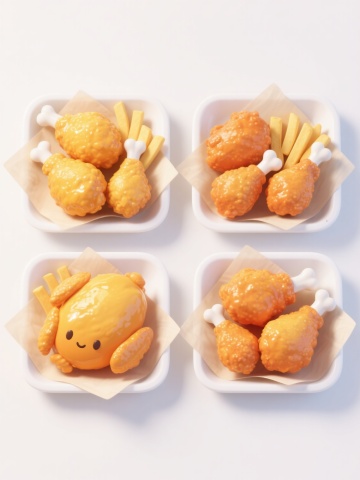 3D卡通风插画风格,白色背景,四盘不同款式、不同样式、不同配色的炸鸡整齐排列,每盘炸鸡具有圆润饱满的3D质感,表面呈现酥脆的油炸纹理和光泽感,采用明快鲜亮的色彩搭配,炸鸡形态包括带骨鸡腿、无骨鸡块、鸡翅等多种样式,每盘炸鸡旁点缀少量薯条,整体画面干净整洁,充满卡通趣味和食欲感,风格统一且细节丰富。