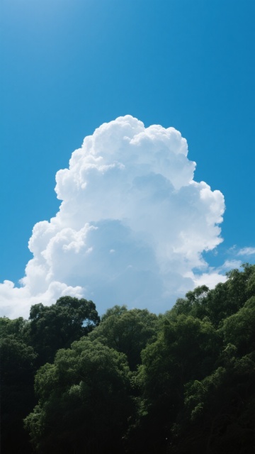 一张写实风格的风景照片,画面底部是茂密的深绿色树木剪影,占据画面下方约四分之一区域,树木枝叶细节丰富,呈现自然的深绿至墨绿的渐变色调。树木上方是巨大而蓬松的白色积雨云,云层厚实,具有强烈的立体感和层次感,云团边缘清晰,内部因光线照射呈现出从亮白到浅灰的微妙过渡,云朵形态饱满,仿佛触手可及。云层之上是占据画面上半部分的纯净、深邃的湛蓝色天空,天空颜色均匀,没有杂色,展现出晴朗、开阔的视觉效果。整体构图采用低角度仰拍,营造出天空与云彩的宏伟壮丽之感,光影对比鲜明,阳光从云层上方照射下来,使云顶呈现明亮的白色,而云层底部和树木则处于相对的阴影中,形成自然的明暗层次。画面整体传达出宁静、开阔、清新且充满力量的自然氛围,色彩和谐统一,以蓝、白、绿三色为主,展现了夏日晴空下的自然美景。