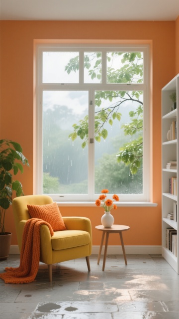 极简主义风格的室内背景,温暖的原木色大型书架占据整个墙面,整齐排列着各种尺寸的书籍、相框、陶瓷花瓶和小型绿植盆栽,书架前放置一把浅色扶手椅和一盏简约落地灯,地面铺有浅色木地板和圆形灰色地毯,右侧有一盆大型绿植,左侧是明亮的落地窗,透进柔和的自然光,整体色调以米色、原木色和浅灰色为主,营造出干净、宁静、舒适的居家氛围,空间布局开阔,光线充足,细节丰富且具有生活气息。