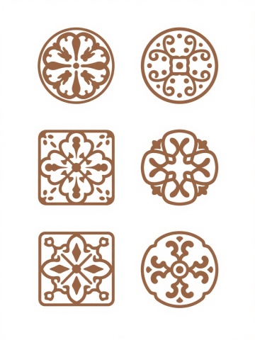 六个同系列矢量花纹图案,每个图案均为圆形或方形轮廓的对称式传统花纹,以单一棕色线条勾勒,白色填充,整体风格简约复古,排列成两行三列的规整布局,所有花纹造型、角度和细节装饰完全不同,均为独立原创设计,背景为纯白色,无任何文字、二维码或其他元素干扰,保持统一的配色方案和装饰性设计感。
