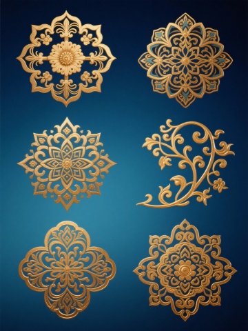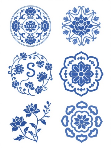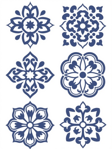 一套六个不同的传统花纹图案,每个图案都以对称的几何花卉为基础,采用简约的线条勾勒,以深蓝色为主色调,白色为背景,图案大小均匀,呈两行三列规整排布,整体风格古典雅致,具有浓厚的传统装饰艺术气息,单个图案独立完整,适合用于传统风格的装饰设计素材集合。