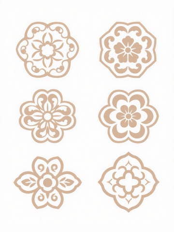 六个同系列传统纹样集合,每个纹样均为不同造型与角度的花卉装饰图案,采用统一的浅棕色线条勾勒,白色填充,背景为纯白色,纹样整体呈圆形或多边形轮廓,细节包含对称的卷草纹、花瓣纹和几何装饰元素,六个纹样排列成两行三列的规整布局,彼此间距均匀,整体风格简约典雅,具有传统东方美学韵味。
