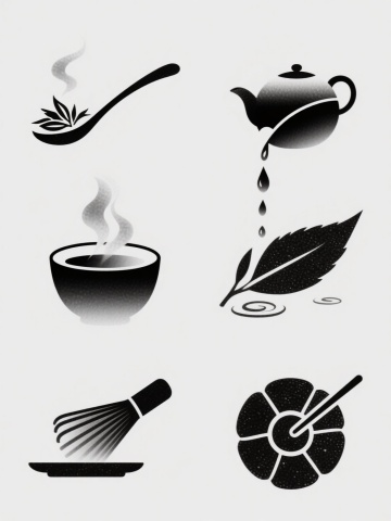 纯色背景上,以极简黑白剪影风格呈现六个完全不同的茶元素系列素材集合,规整排布。每个元素均采用流畅的曲线轮廓与细腻的颗粒状渐变纹理相结合的表现手法,保持统一的视觉语言:1. 一个带有飘逸茶叶图案的圆形茶饼,边缘有精致的压纹;2. 一套嵌套的盖碗茶具,盖子微微掀起,一缕颗粒状蒸汽向上飘散;3. 一片舒展的茶叶,叶脉纹理以颗粒渐变勾勒;4. 一个正在倾倒茶汤的茶壶,壶嘴有弧线形水流;5. 一个盛满茶叶的茶荷,边缘呈波浪状;6. 一个三足茶炉,炉上有简化的火焰图案。所有元素均为纯黑色剪影,带有细腻的白色颗粒渐变效果,营造出层次感和精致感,整体构图平衡且具有现代设计感。