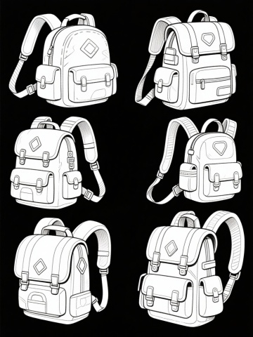 一组6个完全不同造型的背包系列素材集合,每个背包造型独特、装饰各异,保持原线稿风格和元素内容,采用纯色背景,整体色彩变换,以规整排布呈现,每个背包都有独立的设计细节和装饰元素,线条清晰流畅,风格统一。