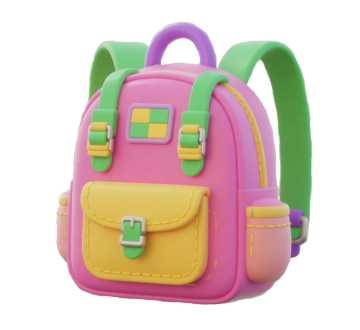 一套彩色卡通风格的学习用品插画,包含橙色黄色渐变书包、绿色直尺、蓝色铅笔、红色橡皮、橙色三角尺和蓝色翻开的笔记本,所有物品边缘有黑色描边,内部填充明亮饱和的色块,部分区域有白色高光点缀,整体呈现平面化、简约可爱的儿童插画风格,保持纯白色纯色背景,变换为更具立体感的半扁平化设计,物品添加轻微的体积感和光影过渡效果,保持原有色彩搭配和物品识别性,构图均衡分布于画面中