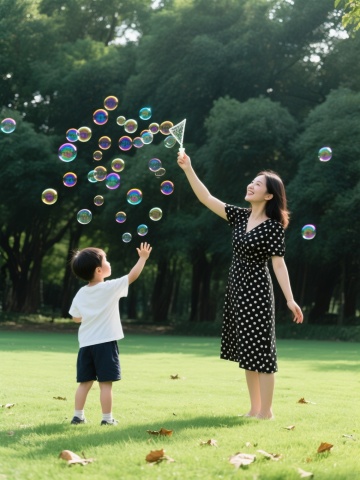 自然光下的户外公园场景,茂盛的深绿色树木形成浓密背景,阳光透过树叶洒下斑驳光影,大片修剪整齐的鲜绿色草坪,前景有几片散落的枯叶。一位穿着黑白波点连衣裙的女性正侧身站立,左手向上伸展高举着泡泡棒,右手自然下垂,身体微微前倾,面带微笑注视着前方;一个穿着白色短袖T恤和深色短裤的小男孩站在她前方稍偏左位置,双脚微微分开,右手伸出试图去触碰那些漂浮在空中、大小不一、表面有彩虹光泽的透明肥皂泡,泡泡在阳光照射下呈现出淡淡的彩色反光。整体画面色彩清新自然,充满温馨欢乐的氛围,构图采用三分法,人物位于画面右侧,泡泡群在两人之间形成视觉连接,呈现出母子互动玩耍的生动瞬间,具有真实生活的质感和温暖的情感传达。