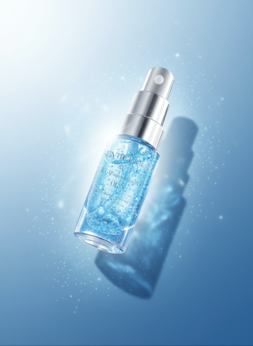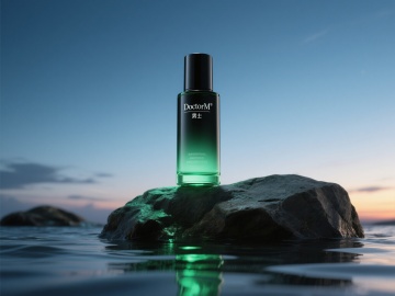 两瓶长圆柱形的绿黑色渐变男士爽肤水,一瓶站立在黑色岩石上,另一瓶斜靠在站立的瓶子旁,产品底部有水,背景是蓝天和绚烂晚霞,光线照射在黑色岩石上,玻璃瓶透出绿光,环境光,发光的水,男士硬朗风格,品牌灵魂设计,光影效果,广告拍摄感,大牌视觉,整体画面绿色发光,暗色调