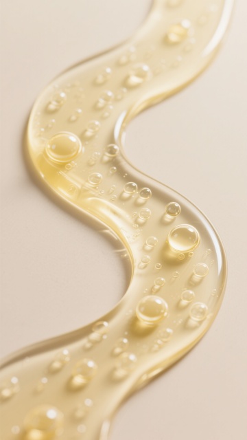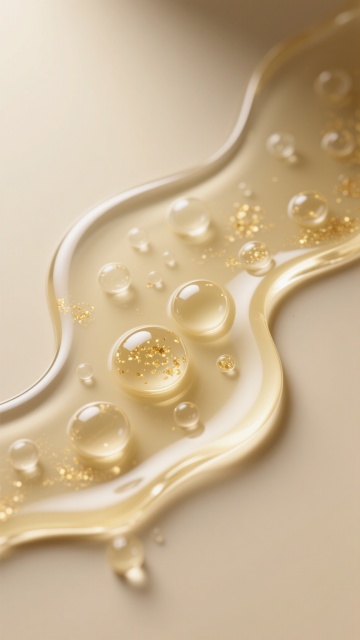 一张符合超写实3D渲染风格的精华液流体图片,画面中半透明大油滴包裹小分子结构和气泡,周围环绕金色波浪状液体与悬浮小油珠,整体营造出奢华、水润、科技感的氛围。