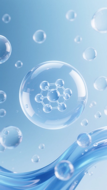 一张以透明水泡和蓝色水流为主体的3D渲染背景图,画面中充满了大小不一、晶莹剔透的水泡,其中最大的水泡内包含一个由多个小分子结构组成的透明球体,水泡表面有细腻的高光和反光效果,背景是渐变的浅蓝色调,光线柔和明亮,营造出纯净、清新、科技感十足的氛围,整体构图采用了梦幻般的悬浮效果,水滴和水泡的形态自然流畅,具有高度的透明质感和立体感,适合作为纯净科技或护肤品相关的背景使用。