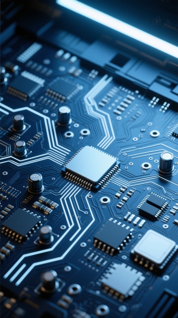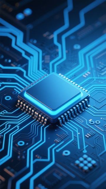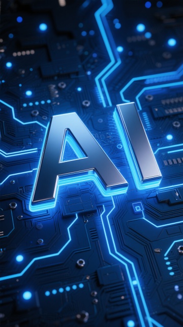 深蓝色背景上,以电路板纹理为基础,中央矗立着巨大的、立体发光的蓝色"AI"字母,字母内部有精细的电路纹路,周围环绕着流动的蓝色光效和闪烁的星点粒子,整体呈现出赛博朋克风格的科技感与未来感,具有强烈的视觉冲击力和深度感,营造出神秘而先进的氛围。