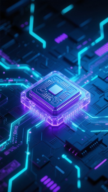 未来科技感3D插图,深蓝色为主色调,搭配紫色和青色的霓虹光效,中央放置一个六边形轮廓的量子处理器芯片,芯片表面有复杂的立体电路纹路和全息投影效果,周围环绕着流动的光线粒子和动态数据数据流,背景是由不规则几何图形和发光线路构成的抽象电路板,整体呈现出深邃神秘的赛博朋克氛围,光线从芯片中心向外辐射,形成柔和的光晕和清晰的阴影层次,材质表现为光滑的金属质感与半透明的水晶质感相结合,构图采用中心聚焦式,强调芯片的核心地位,画面充满科技感与未来感。