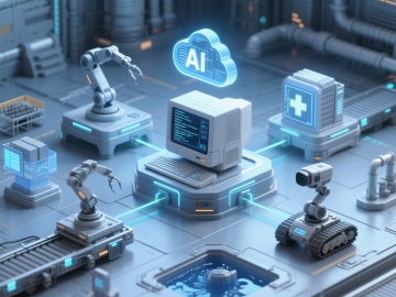 等轴视角的 3D 数字孪生工业场景,画面中心是一台未来感的电脑主机/控制中枢,显示悬浮的 AI 算法代码界面和数据云标识;周围环绕多个象征业务领域的 3D 模块:机械臂+输送平台(代表智能制造)、履带式特种机器人+水池反应堆模块(核电与异物检测)、医疗十字与手术监护界面模块(智慧医疗)、城市建筑+管道检测模块(城市排水识别)、摄像机/传感器模块(AI感知)。所有模块通过发光的数据线连接,构成信息中