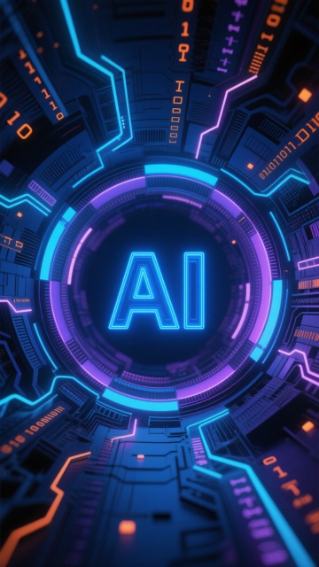 深色科技感背景,中央悬浮着由发光蓝色粒子构成的立体“AI”字样,周围环绕着动态旋转的二进制数字流与电路板线路,光线呈现出柔和的蓝紫色渐变,带有未来感的霓虹光晕效果,整体营造出神秘而前沿的人工智能科技氛围,加入抽象的神经网络节点与数据流线条元素,保持科技感与数字主题的统一性。