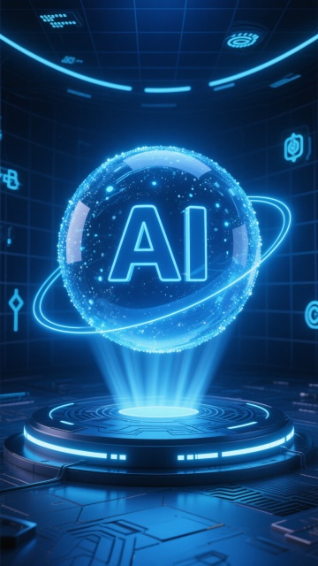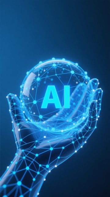 深蓝色渐变背景,一只由发光蓝色线条和点构成的抽象手,掌心托着一个由蓝色网络线条和闪烁光点组成的半透明球体,球体中央有明亮的蓝色“AI”字样,整体呈现科技感十足的3D数字艺术风格,光线从球体中心向外柔和发散,营造出神秘而前沿的氛围,画面简洁大气,突出AI科技主题。