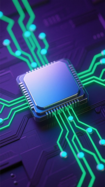 未来科技感3D渲染风格海报,以深邃的暗紫色为背景基调,中央悬浮着一个造型更为流线型、边缘带有柔和弧度的六边形处理器芯片,芯片表面呈现出金属光泽与蓝色渐变的科技感材质,周围环绕着发光的绿色电路板纹路,线路以动态放射状向外延伸并点缀着闪烁的青色光点,整体光影效果强调芯片的悬浮立体感和科技神秘感,光线从芯片中心向四周柔和发散,营造出高端、前沿的数字科技氛围,构图采用中心对称布局,突出芯片主体,视觉层级清晰,信息传达高效,符合科技产品宣传的设计感。