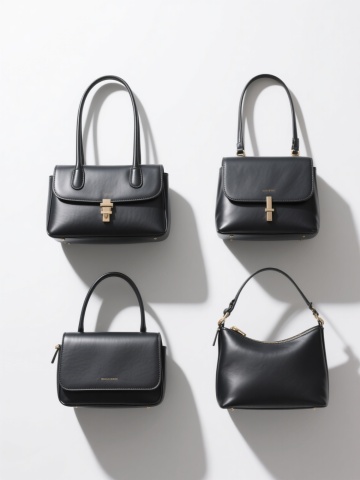 四个不同风格的手提袋设计集合,每个手提袋都有独特的造型和色彩,在纯色背景上整齐排列。第一个手提袋采用简约现代风格,白色背景,黑色线条勾勒出几何图案,造型方正,配有细长的黑色提手。第二个手提袋是复古波西米亚风格,米色背景,印有彩色花卉图案,造型圆润,提手为编织材质。第三个手提袋是未来科技风格,银色背景,带有金属光泽的几何切割造型,提手为透明材质。第四个手提袋是可爱卡通风格,粉色背景,印有卡通动物图案,造型为圆形,提手为彩色绳结。所有手提袋都保持了手提袋的基本结构,包括袋身和提手,但在造型、色彩和图案上各有特色,整体呈现出多样化的设计风格。