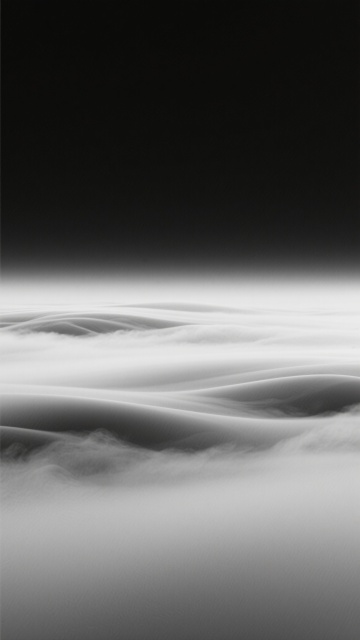 极简主义风格的黑白抽象背景,画面下方是层次丰富、形态柔和的灰白色雾气,雾气呈现出流动的质感,边缘朦胧虚化,向上逐渐融入大面积深邃的黑色背景,形成强烈的明暗对比,整体构图以大面积留白和简洁的色彩关系营造出神秘、宁静且富有意境的氛围,无任何文字或具象元素干扰。