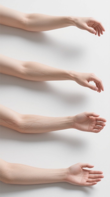 超写实风格的手部特写,一组4个不同的手部动作,每个手部都具有细腻的皮肤纹理、自然的掌纹和清晰的指甲细节,柔和的光线从斜上方照射,形成自然的高光和阴影过渡,皮肤呈现出健康的淡粉色调,手腕部分自然延伸,整体画面背景为纯白色,突出手部的立体感和真实质感,构图简洁大方,每个手部动作姿态自然且具有区分度,展现手部的灵活与美感。