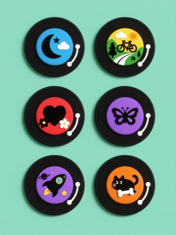 6张不同配色、不同样式的唱片,3D卡通风,纯色背景,排列整齐,唱片边缘有圆滑处理,盘面有简洁的几何图案装饰,色彩明快鲜艳,每张唱片颜色各异,整体构图对称平衡,视觉层级清晰,具有现代海报设计感,适合音乐主题宣传。
