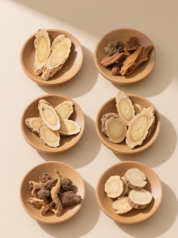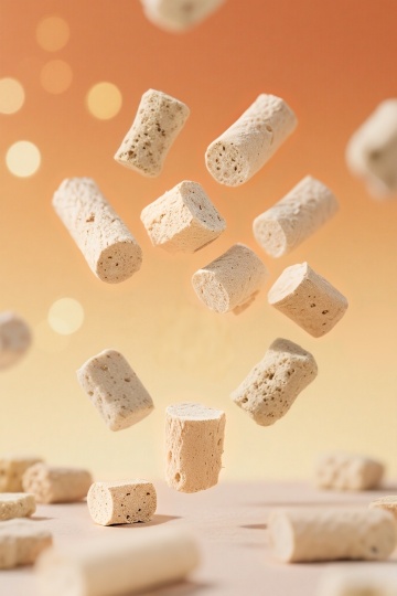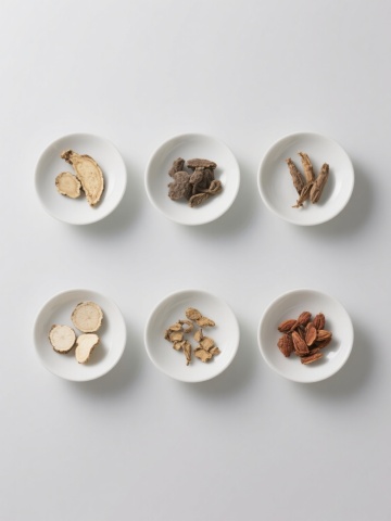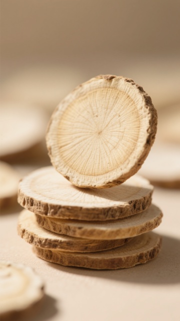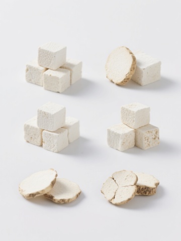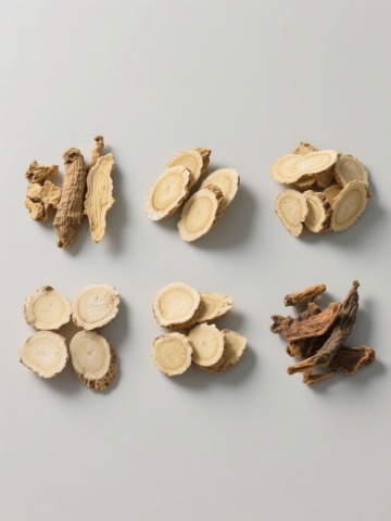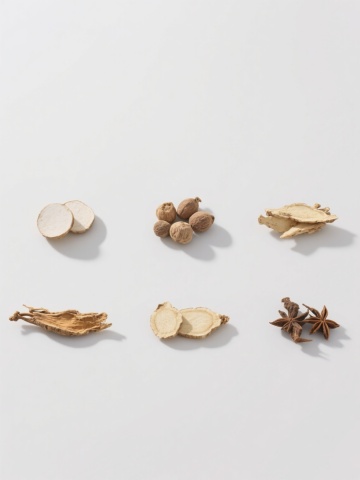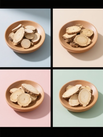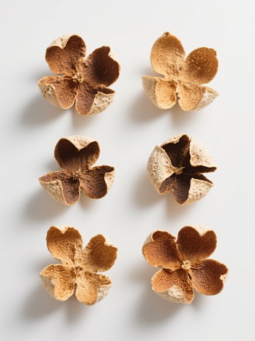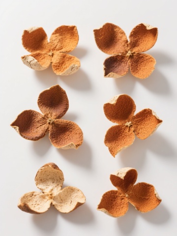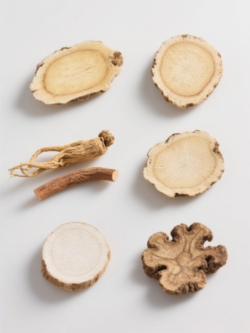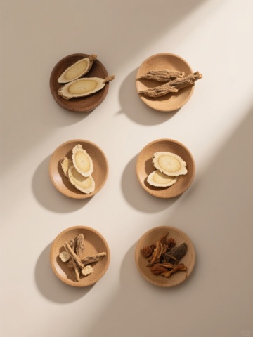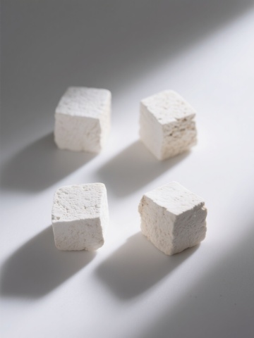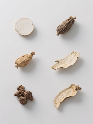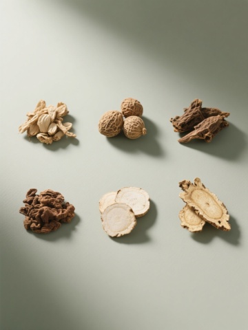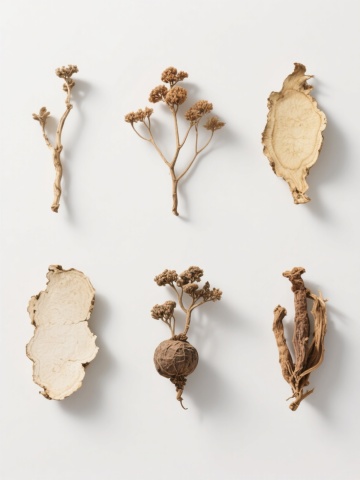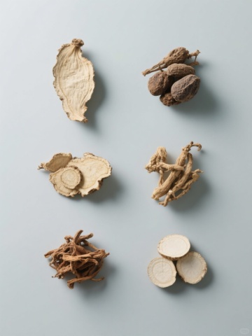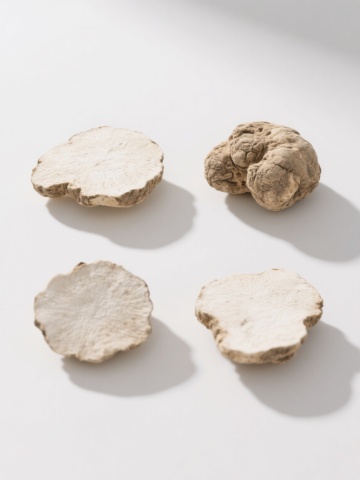一组4个规整排布的茯苓素材,每个茯苓呈现不同的简约现代造型样式,纯净的白色背景,高清晰度的产品特写,柔和的侧上方光源,细腻的表面纹理质感,清晰的阴影投射,简约、干净、现代的视觉风格,无任何文字、logo和水印。
