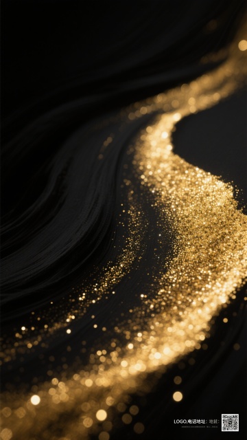 一张黑金背景的设计图,整体艺术风格为写实,主色调为黑色和金色,色彩和谐。黑色背景深邃纯粹,金色元素以细腻的颗粒状呈现,具有强烈的质感。光影运用上,金色颗粒在黑色背景的衬托下,边缘有明亮的高光,中间部分光影过渡自然,展现出丰富的层次感。颗粒的笔触质感细腻,每一粒都清晰可见,整体呈现出一种流动、飘逸的动态效果。构图布局上,金色颗粒主要集中在画面的一侧,形成不对称的视觉平衡,有自然的视觉引导线,从密集处向四周逐渐扩散,营造出一种神秘而高贵的氛围。没有任何文字、LOGO、电话地址及二维码等元素,画面简洁纯粹,信息传达效率高,符合高端、奢华的设计感,适合作为高端产品的背景或具有艺术感的装饰画面。