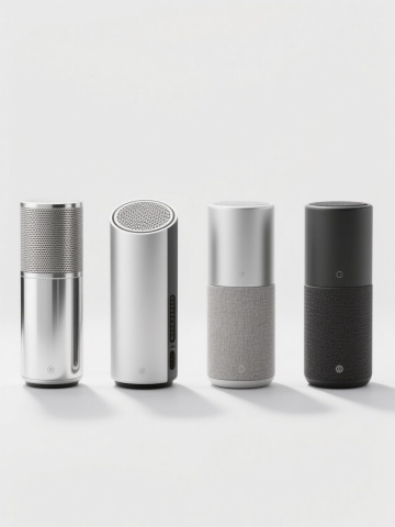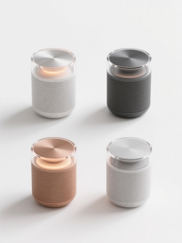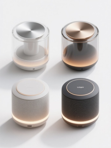 4个不同款式的现代简约风格音响,呈规整排布,延续原图的3D渲染质感与平滑过渡光影,主体采用黑、灰等中性色调,部分音响底部或侧面带有蓝紫色渐变光效,透明材质与磨砂网面细节清晰,统一置于纯色背景上,整体构图平衡对称,无任何文字、logo及水印元素,保持科技感与极简美学的视觉统一。