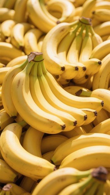 大量新鲜成熟的黄色香蕉紧密堆叠充满整个画面,饱满果形带有自然弯曲弧度,明亮的金黄色果皮光滑有光泽,顶部浅绿色果柄与黄色果皮形成柔和过渡,强光照射下香蕉表面呈现明显的高光和阴影对比,营造出鲜明的立体感和真实的水果质感,整体画面色彩鲜亮明快,充满丰收与新鲜的视觉感受,高分辨率写实摄影风格,细节清晰,色彩饱满,光影层次丰富。