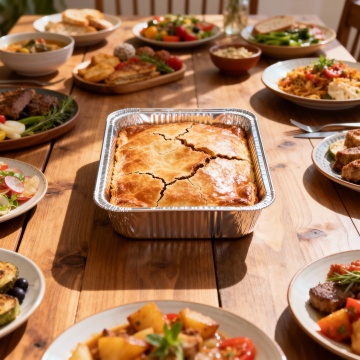 一张摆满丰盛美食的木质餐桌,干净明亮的现实风格场景,适用于背景素材。中央是大块的牛排、烤虾、烤鸡等肉类,搭配薯条、玉米、烤蘑菇等蔬菜,还有意面、沙拉和烤肉串。食物色彩鲜艳,摆放整齐,光线柔和,营造出温馨诱人的用餐氛围,整体画面干净整洁,无多余元素干扰。