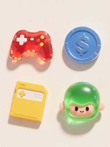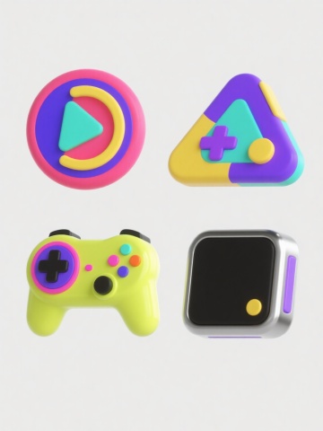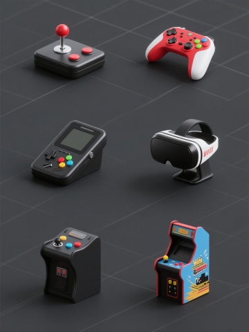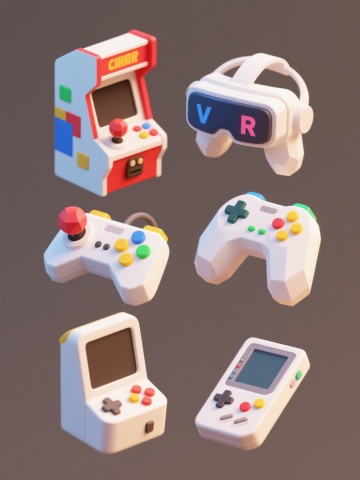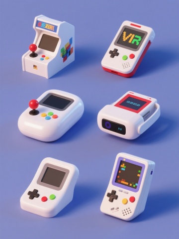 一组6个完全不同的游戏机元素集合,保持统一的3D立体风格,柔和圆润的造型,光滑的塑料质感,鲜艳明快的配色方案,每个元素都有清晰的高光和柔和的阴影,纯色背景,元素规整排布,视觉层次分明,包括街机摇杆、掌上游戏机、复古红白机、VR头盔、游戏手柄、街机框体,每个元素都具有独特的形态和细节,整体呈现出活泼、现代的设计感,符合游戏爱好者的审美,信息传达直接明了。