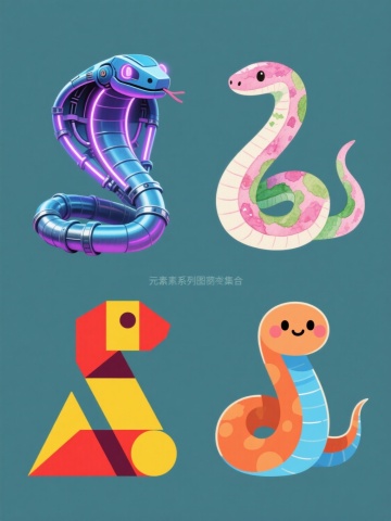 四张一组的系列素材集合,每张均为纯色背景上盘踞的爬行动物,保持相同的3D渲染风格、细腻鳞片纹理、金属光泽质感和写实光影效果,元素类目统一为爬行动物,画面整体色彩分别变换为金色、银色、铜色、青铜色,元素内容完全不同:第一张是金色眼镜蛇,第二张是银色蟒蛇,第三张是铜色响尾蛇,第四张是青铜色王蛇,所有元素规整排布成2x2网格布局。