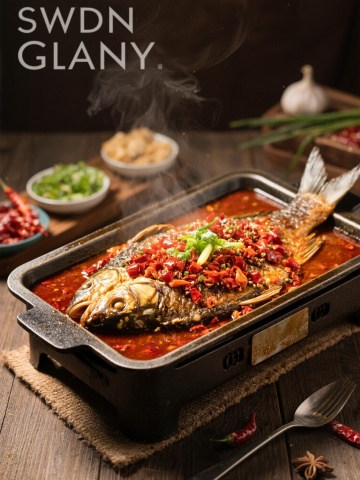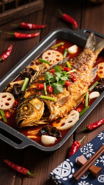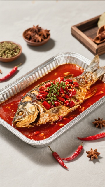 高清美食摄影风格,特写镜头展现一个银色波纹金属烤鱼盘,盘中盛放着红亮沸腾的麻辣烤鱼,鱼身覆盖大量干辣椒、青花椒和红色酱汁,肉质鲜嫩,汤汁浓郁。背景为灰色石质台面,左侧有一个打开的木质香料盒,内有肉桂和香叶,旁边摆放两个黑色小碗,分别装有八角和混合香料,台面散落几颗完整的红辣椒和八角,整体光影柔和,突出食物的质感与色彩对比,营造出浓郁诱人的中式川菜氛围,无文字和LOGO。