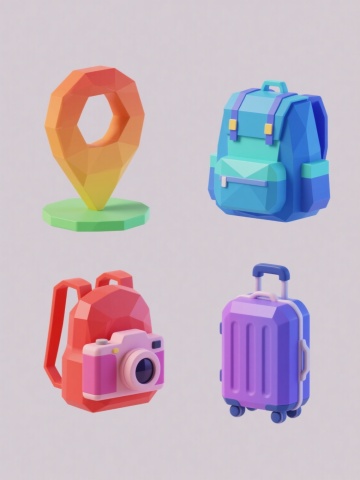 四个3D风格的音乐节元素素材,以规整网格排布在纯色背景上。每个元素造型各异,包含电吉他、音箱、麦克风、唱片等音乐节相关物体。整体采用明亮鲜艳的色彩,以粉色、紫色、蓝色为主色调,带有霓虹光效和渐变处理。物体表面有丰富的细节纹理,如旋钮、按钮、线缆等,呈现出立体感和材质感。光影效果突出,有明显的高光和阴影,营造出空间层次。设计风格充满活力和动感,符合音乐节的热闹氛围。