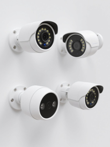 4个不同造型样式的摄像头图标,采用高细节写实风格,每个摄像头都有金属质感的黑色外壳和多层玻璃镜片,镜片内部呈现出丰富的彩色反光和渐变光晕效果,高光区域明亮且锐利,阴影细节清晰自然,整体排布规整对称,背景为纯色(非透明),无任何文字、logo和水印。