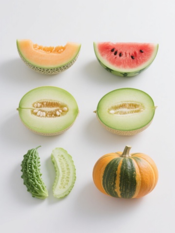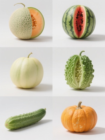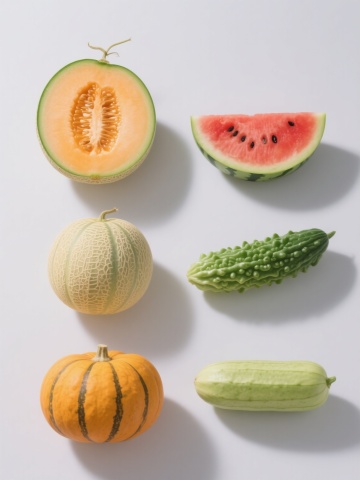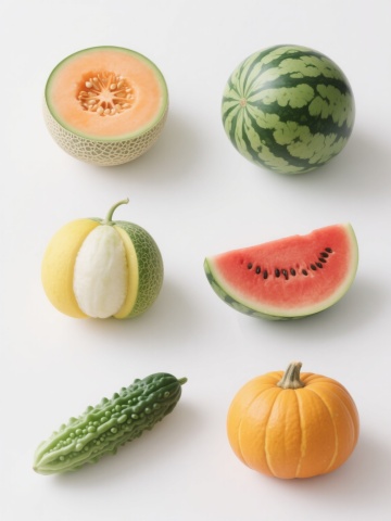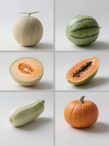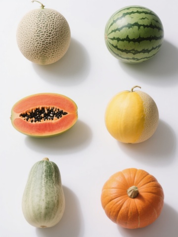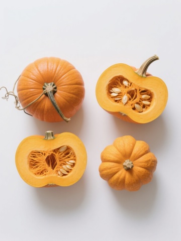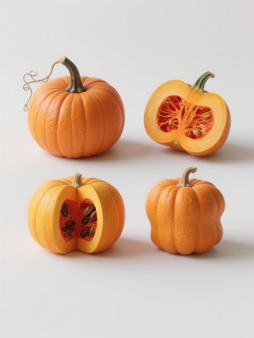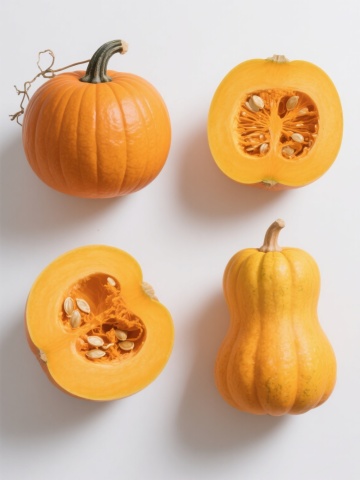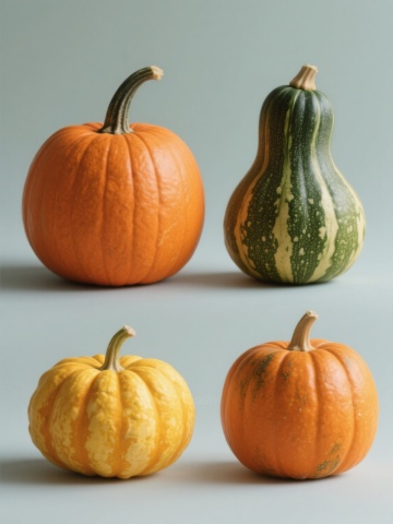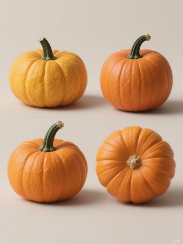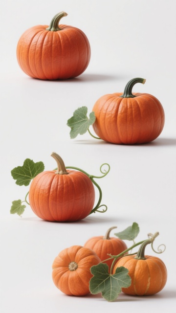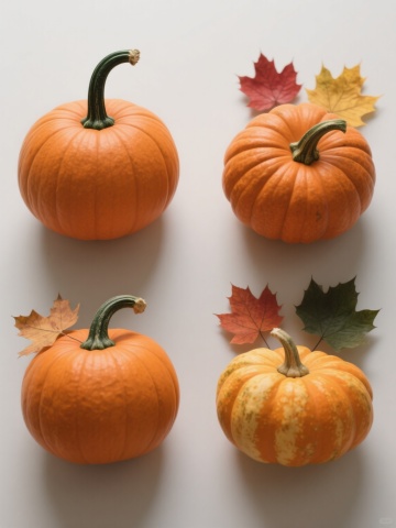 超写实摄影风格,4个不同造型样式的南瓜规整排布,保持真实的南瓜质感(橙黄色、黄色渐变表皮,深绿色弯曲瓜蒂,带有自然的条纹和细微凹凸纹理),搭配深浅不一的橙黄色、黄色和深绿色秋季枫叶作为点缀,所有元素置于纯白色纯色背景上,光影为柔和的自然光,高光和阴影过渡自然,立体感强,无任何文字、logo、水印,整体画面干净简洁,色调统一和谐,具有清晰的视觉层次。