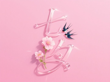 甜美清新插画风,软3D玻璃质感字母与花朵、飞鸟结合,营造梦幻春日氛围。