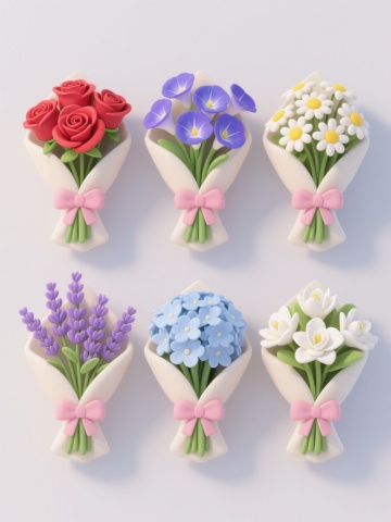 软3D风格花束系列素材,6个不同花束规整排布,每个花束均采用相同的米白色包装纸包裹,搭配粉色蝴蝶结系于下方,绿色花茎从包装纸中伸出,整体呈现柔和边缘与明亮色彩,背景为简洁纯色。花束种类分别为:红色系玫瑰花束、蓝紫色系牵牛花束、黄色系小雏菊束、淡蓝色系绣球花束、紫色系薰衣草花束、白色系栀子花束,每个花束细节丰富,保持相同的构图和光影效果,整体画面清新可爱,视觉风格统一。