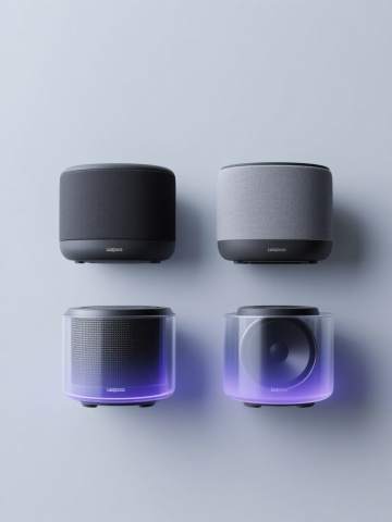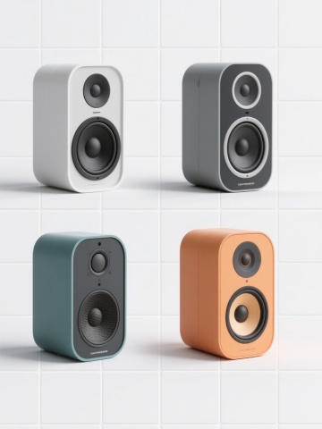 六个不同颜色不同款式的3D风格音响,整体造型简约现代,采用纯色背景,无任何文字、logo和水印,音响表面有光滑的渐变色彩和金属质感的细节,光影效果柔和,呈现出清晰的立体感和空间感,六个音响整齐规整地排布在画面中,形成和谐统一的视觉效果。