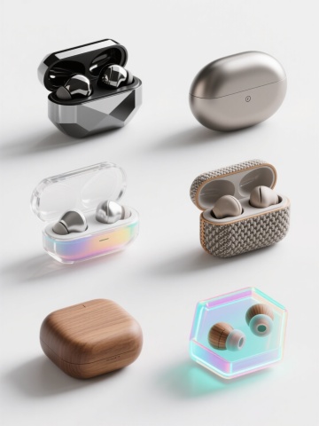 6款不同材质与造型的无线耳机及其充电盒组成的系列产品集合,在纯白色纯色背景上以规整的网格状排布。每款耳机都保留核心的入耳式耳塞与充电盒开合形态,但具有完全独特的设计造型:1. 高光泽钢琴漆材质,棱角分明的几何切割充电盒,耳塞表面有精细的菱形切割纹路;2. 哑光磨砂金属材质,圆润流畅的鹅卵石造型充电盒,耳塞带有金属网面装饰;3. 透明亚克力材质,半透明充电盒可看到内部结构,耳塞采用渐变色彩设计;4. 编织纹理布艺包裹材质,方形充电盒带有缝线细节,耳塞表面有细密的针织纹路;5. 木质纹理材质,圆角矩形充电盒搭配原木色,耳塞表面有自然木纹肌理;6. 荧光霓虹材质,不规则多边形充电盒,耳塞带有发光灯带边缘,整体呈现科技感十足的未来主义造型。所有产品均采用简约无Logo设计,保持一致的光影效果,柔和的顶部光源,轻微的底部阴影,突出产品的材质质感与设计细节,形成统一而富有变化的系列感。