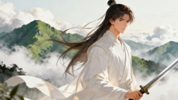华丽古风水墨人物插画 水墨浅色粗湿笔勾线+回折处干脆利落 水墨湿笔铺色,水彩看涂晕染,弥散渐变,色彩饱满有层次,水迹点染,金色银色点缀 宣纸质感,粗颗粒质感 时间凝固瞬间,动感构图,大写意留白 人物特写,从头顶俯瞰,暗色调,主题枯萎,主色深绿+幽蓝+暗红+黎色+浅云背景,墨色长卷发男子 丝绸+丝绒 深蓝色交领汉服 红色内衣 黑色细躞蹀腰带 绸缎般的浓密长发+高光 繁复褶皱+华丽饰品和纹理 意境