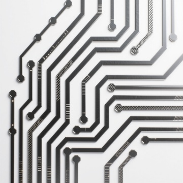电路板主题的抽象科技感插画,以白色为背景,中心是一个带有密集针脚和方形内核的芯片,周围环绕着由蓝绿色和深蓝色线条构成的复杂电路网络,线条呈现出流畅的曲线和直线交织形态,点缀有小型方形芯片和圆形焊点等电子元件,整体风格简洁现代,色彩过渡自然,具有清晰的视觉层次和科技氛围,无文字信息。
