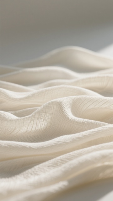 一张高清摄影风格的布料纹理特写,主体为柔和米白色的轻薄面料,呈现出自然流畅的波浪形褶皱,纹理细腻可见细微的编织纹路,整体质感轻盈飘逸。光线从斜上方柔和洒下,在布料表面形成明暗渐变的光影效果,高光区域明亮但不刺眼,阴影部分过渡自然,营造出宁静、优雅且高级的氛围。画面聚焦于布料的质感和褶皱形态,背景简洁纯净,突出布料本身的柔软与垂坠感。