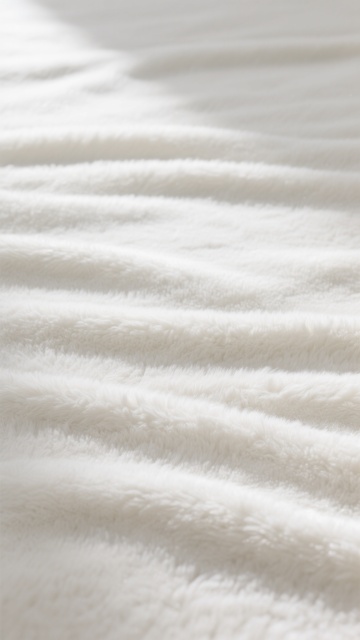 一张高质感的地毯特写,整体呈现纯净的白色调,光线柔和均匀地洒落在表面,营造出明亮、洁净的氛围。地毯表面材质改为光滑细腻、纹理清晰的羊毛,保留原有的大面积覆盖构图和自然的褶皱起伏感,羊毛纤维紧密且带有细微的自然光泽,展现出柔软而富有弹性的质感,整体视觉效果保持与原图一致的简约、高级感。