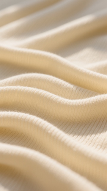 柔和米黄色针织面料的细腻纹理特写,布料呈现自然流畅的波浪状褶皱,光线从斜上方柔和洒下,形成温暖的明暗过渡,展现出面料柔软轻盈的质感与细腻的横向纹路肌理,整体画面简洁纯净,营造出舒适宁静的氛围,适合作为背景使用。