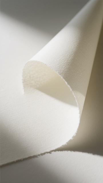 俯视角特写,一片纯净的象牙白便签纸悬浮于无尽的留白空间中,纸张右上角优雅地向内卷曲成完美的120度弧线,卷曲边缘泛着细腻的米白色光泽,纸张表面有极其微妙的亚麻纹理,一束来自左上方45度角的柔和天光在纸面形成渐变的光影层次,靠近光源处呈现珍珠般的亮白,卷曲阴影处透出淡淡的奶油白,纸张边缘切割整齐却带着手工感的细微毛边,整个画面散发着极简主义的诗意与安静的力量。